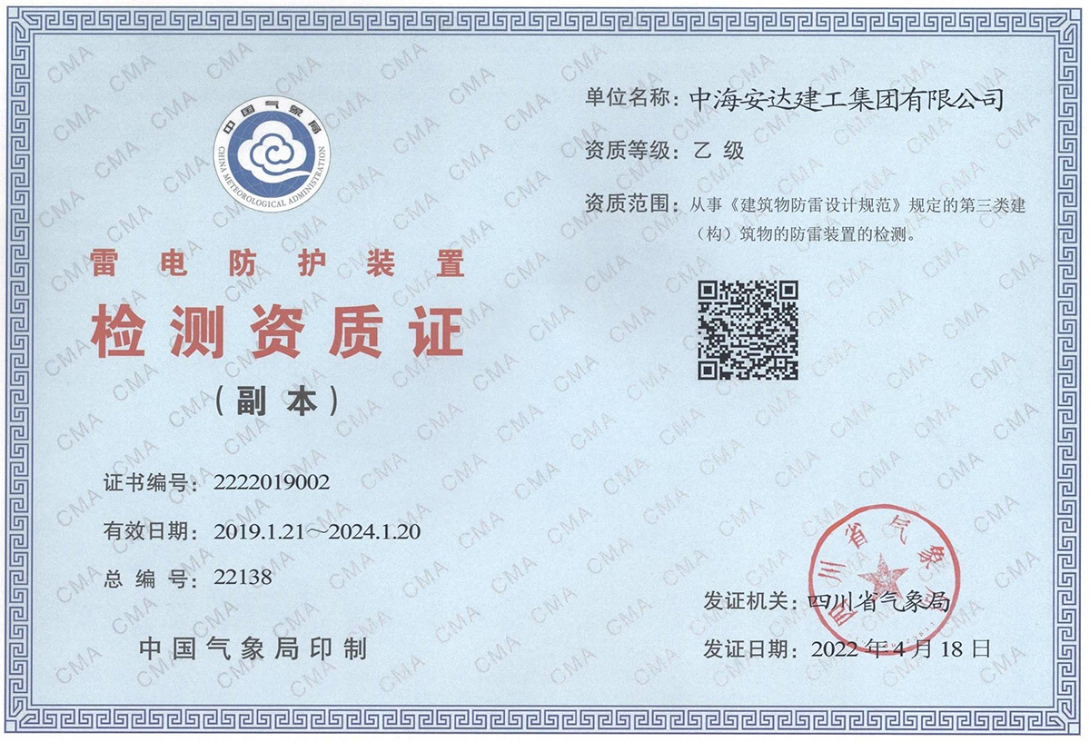 中海安达建工集团有限公司成立于2009年9月,是一家通过主管部门资质认定的,具有工程监理服务、建筑消防设施检测、电气防火安全检测、消防设施维护保养、消防安全评估、防雷装置检测、公共设施安全检测、防雷安全评估、特种设备检测、电梯维护保养、室内环境安全质量监测、建筑节能检测、工程招标代理、工程设计、建筑工程、造价咨询、工程咨询、测绘服务等资质的综合性企业。