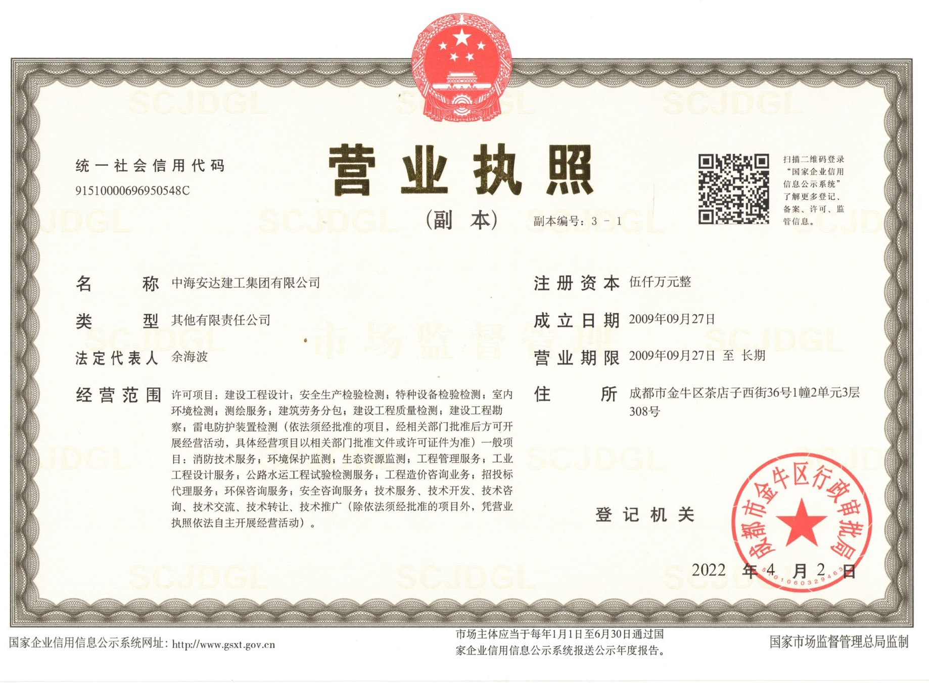 中海安达建工集团有限公司成立于2009年9月,是一家通过主管部门资质认定的,具有工程监理服务、建筑消防设施检测、电气防火安全检测、消防设施维护保养、消防安全评估、防雷装置检测、公共设施安全检测、防雷安全评估、特种设备检测、电梯维护保养、室内环境安全质量监测、建筑节能检测、工程招标代理、工程设计、建筑工程、造价咨询、工程咨询、测绘服务等资质的综合性企业。