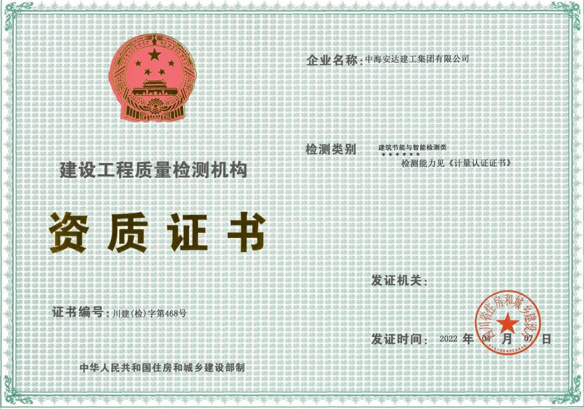 中海安达建工集团有限公司成立于2009年9月,是一家通过主管部门资质认定的,具有工程监理服务、建筑消防设施检测、电气防火安全检测、消防设施维护保养、消防安全评估、防雷装置检测、公共设施安全检测、防雷安全评估、特种设备检测、电梯维护保养、室内环境安全质量监测、建筑节能检测、工程招标代理、工程设计、建筑工程、造价咨询、工程咨询、测绘服务等资质的综合性企业。